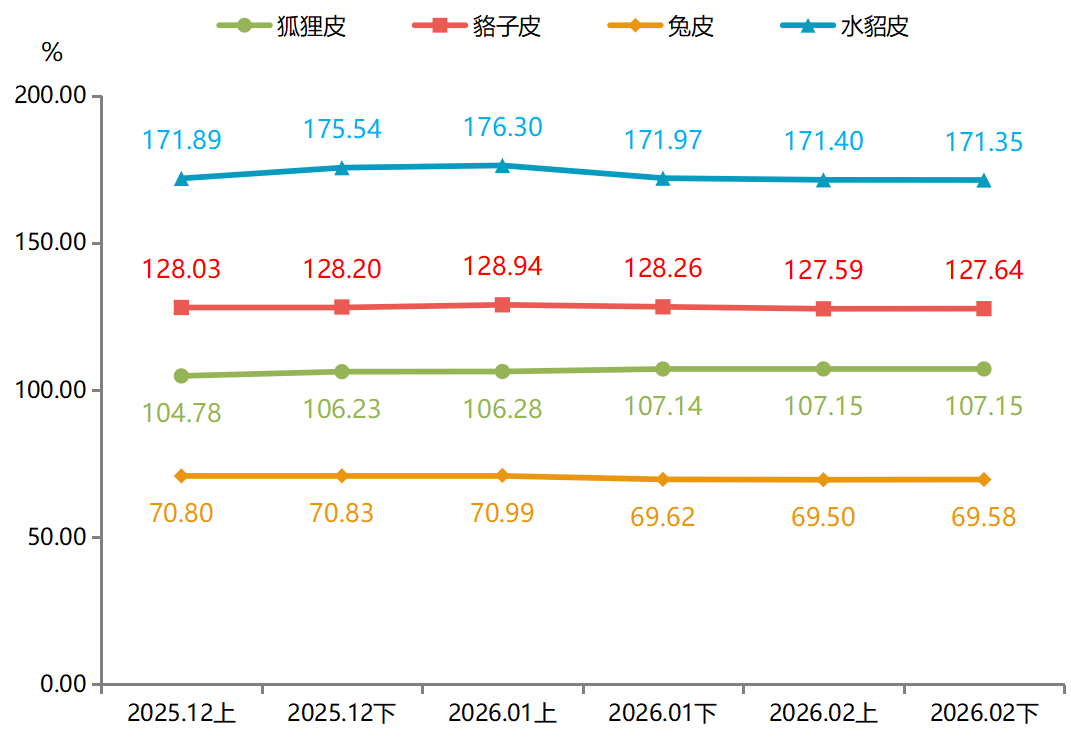 狐狸皮因供给大幅收缩,现正在一个月内就能完成 。兔皮价钱指数收报69.58点,